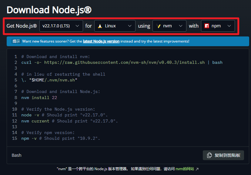 进入node.js官网,点击install node.js进入下载教程页面,由于我没有WIN10专业版系统,所以系统没有docker,直接选择linux的nvm方式进行安装,同时安装npm,如图所示