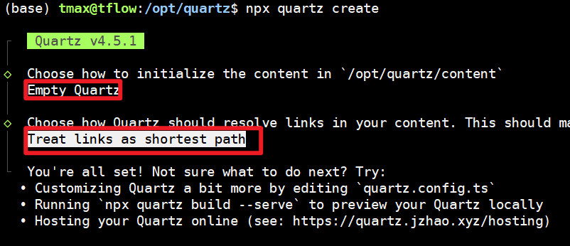 其中,执行create命令后,会通过交互式让用户进行配置选择,选择empty quartzTreat links as shortest path即可,如图所示