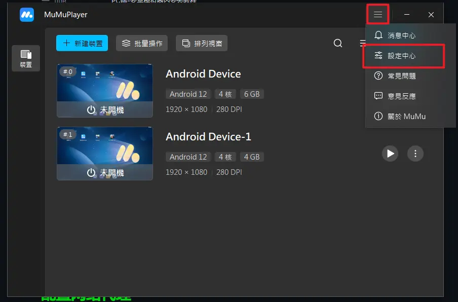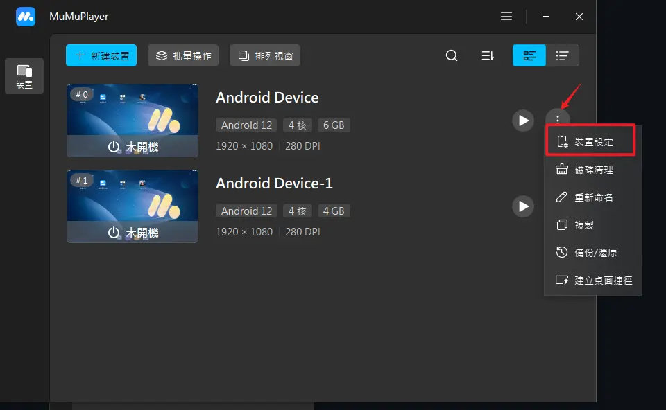 mumuplayer会默认提供1个安卓设备,点击如图的按钮对该安卓设备进行配置