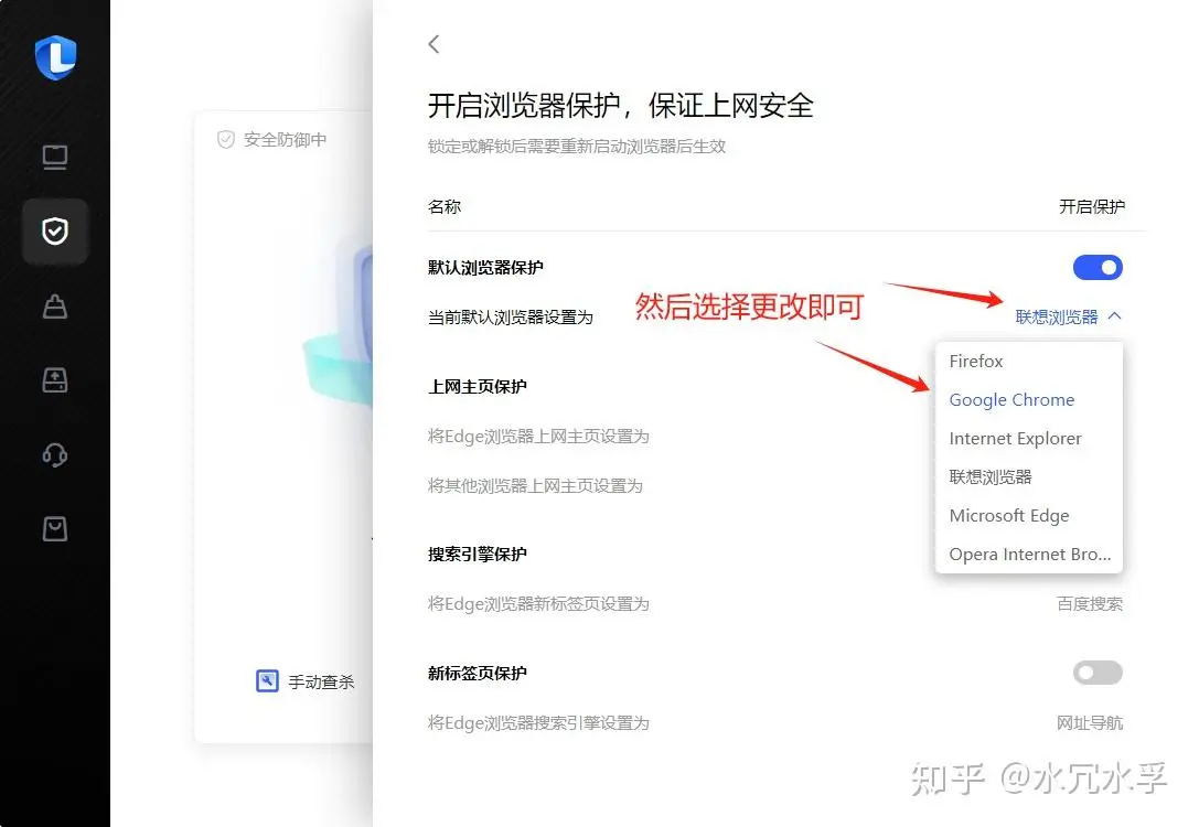 • 如果你设备里还有联想管家,请前往联想管家的设置中心安全防护 里修改浏览器保护提醒的设置。避免锁死默认浏览器为联想浏览器