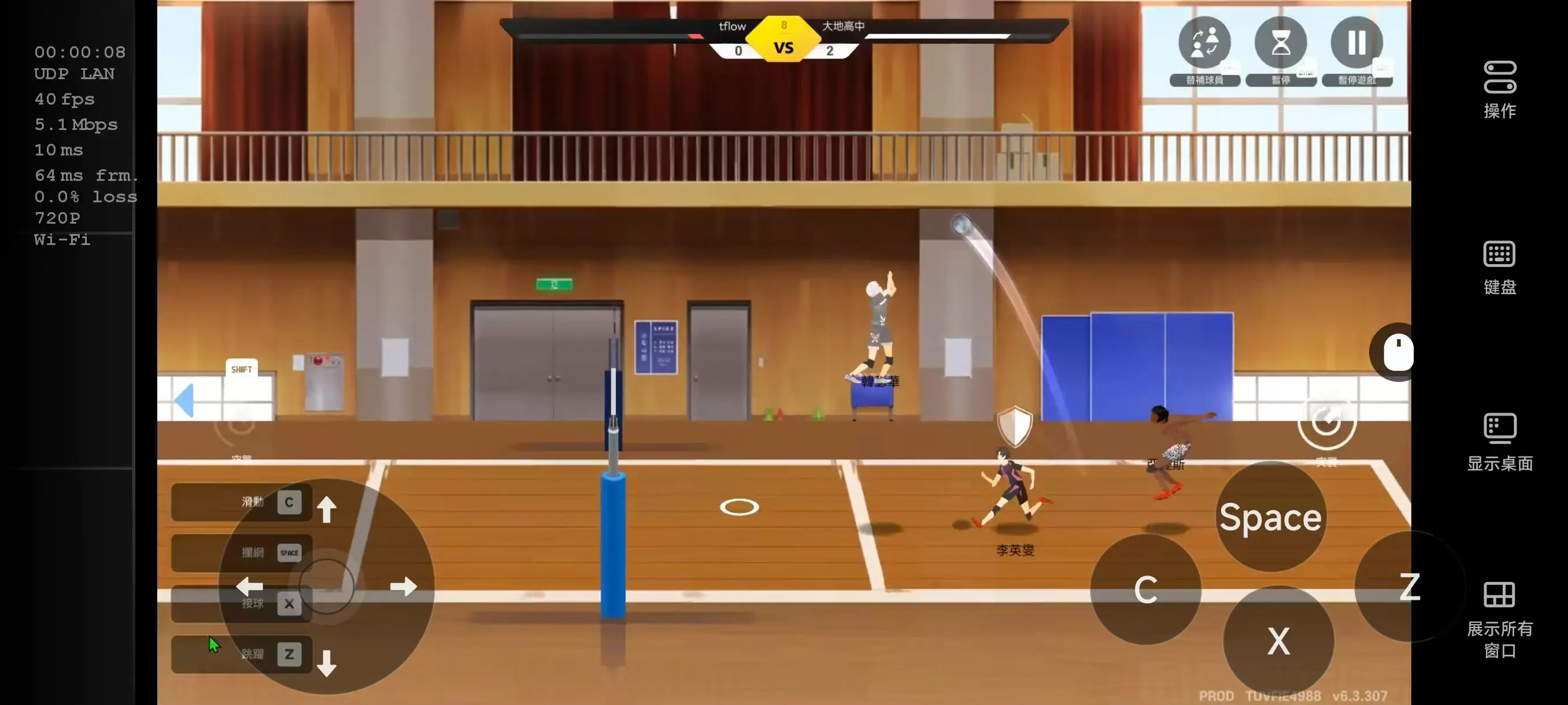 点击右侧的操作启用按键映射切换操作方案,可以是用官方提供的键盘映射布局方案,也可以自己新建自定义键盘映射布局方案。the spike cross 游戏的映射布局如图所示,包含移动、扣球、防守、鱼跃、拦网: