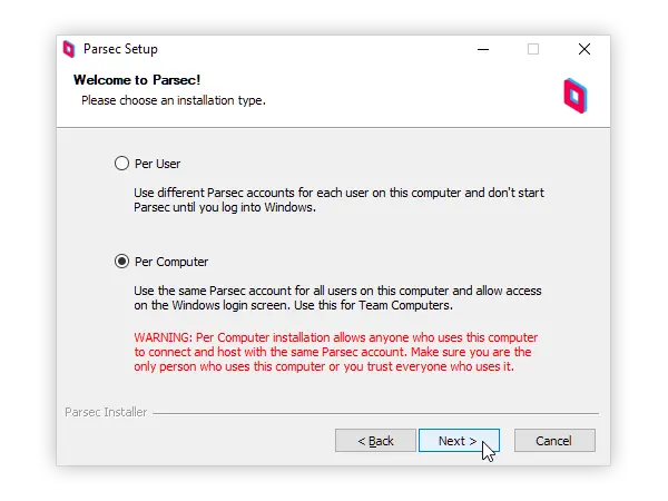 • Per Computer:将允许在 Windows 登录屏幕时提前启动parsec,但也会对计算机上的所有用户使用相同的帐户 (SYSTEM)。如果任何其他用户之前在此计算机上安装了 Parsec 时选择了“Per user”,请记住,这将替换他们的安装