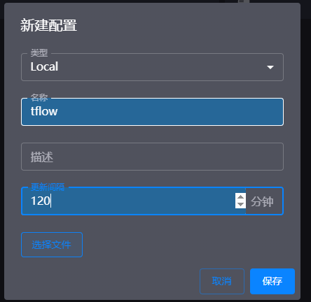 类型选local,名称自定义,更新间隔12分钟,然后选择文件选择刚刚下载的config.yaml,点击保存